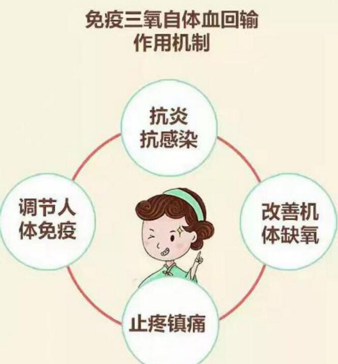 三氧自体血回输的优势 1、无需手术、无创伤—无痛苦、无风险 2、无需造影、无需检查(CT、核磁共振、彩超、心电、血生化等)—更节省 3、无需用药、无副作用—更高效、更绿色 4、从源头上治疗,改善血液本身—无后顾之忧 5、一般情况下,可配合其他治疗方式联合治疗—治疗效果持久