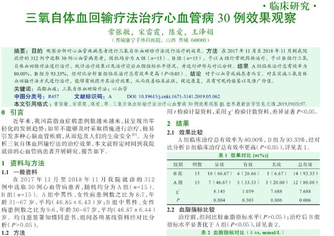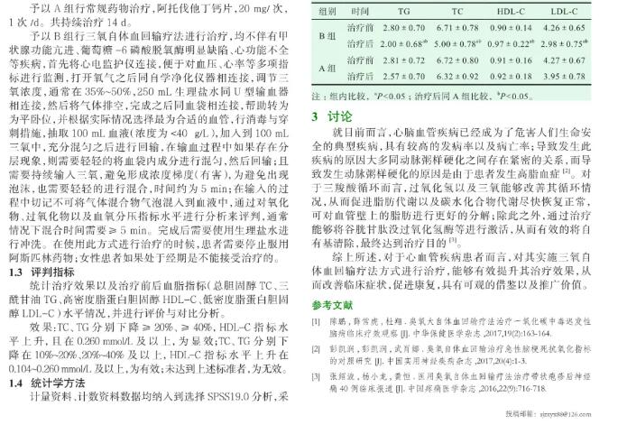 就目前而言,心脑血管疾病已经成为了危害人们生命安全的典型疾病,具有较高的发病率以及病亡率;导致发生此疾病的原因大多同动脉粥样硬化之间存在紧密的关系,而导致发生动脉粥样硬化的原因是由于患者发生高脂血症 。对于三羧酸循环而言,过氧化氢以及三氧能够改善其循环情况,从而促进脂肪代谢以及碳水化合物代谢尽快恢复正常,可对血管壁上的脂肪进行更好的分解;除此之外,通过治疗能够将谷胱甘肽没过氧化氢酶等进行激活,从而有效的将自有基清除,最终达到治疗目的。 综上所述,对于心血管疾病患者而言,对其实施三氧自体血回输疗法方式进行治疗,能够有效提升其治疗效果,从而改善临床症状,促进康复,具有可观的借鉴以及推广价值。