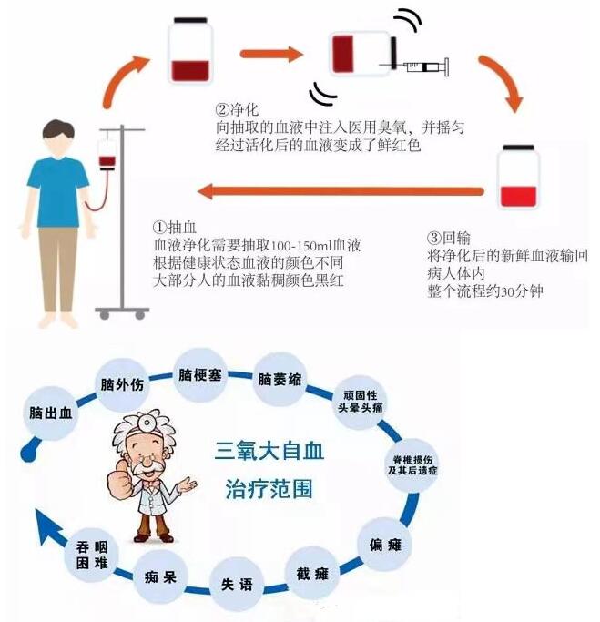 三氧大自血疗法(又称臭氧疗法)是将一定浓度氧气和三氧混合气体与自体血等容量混匀,再回输到体内的一种治疗方法。三氧疗法有效提高红细胞携带氧的能力,刺激机体的非特异性免疫反应,生成多种免疫活性因子(干扰素、白细胞激素、肿瘤坏死因子、粒细胞巨噬细胞集落刺激因子、转化生长因子等),这些分子可增加细胞膜的流动性,达到改善血液健康的效果。
